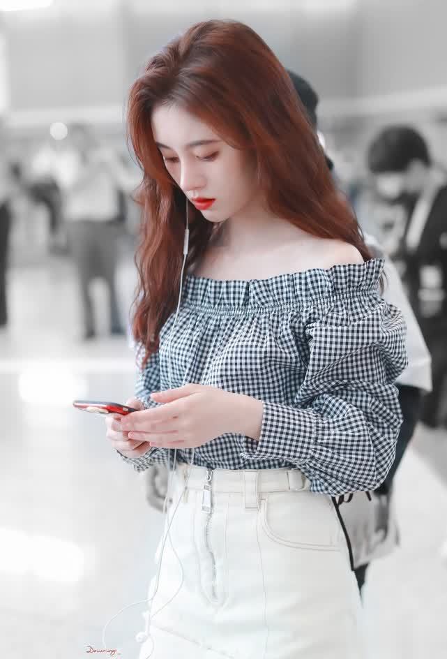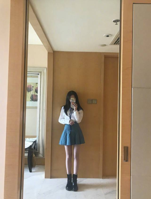 最后看看鞠婧祎的自拍照。白衬衫搭配格纹百褶裙,尽显小清新,少女范儿十足。同样是高腰裙子,采用塞衣角的穿法,秀出了又细又长的美腿。